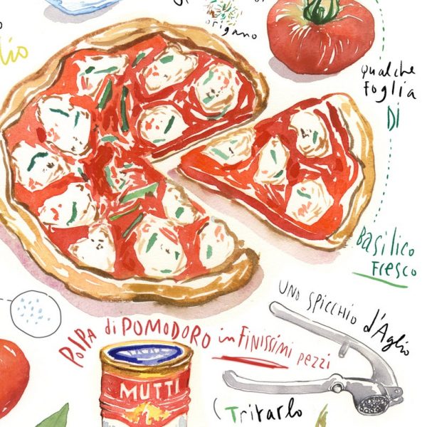 Deze print is een eerbetoon aan de Pizza Margherita, versierd in de kleuren van de Italiaanse vlag: Groen van basilicum, wit van mozzarella, rood van tomaat.